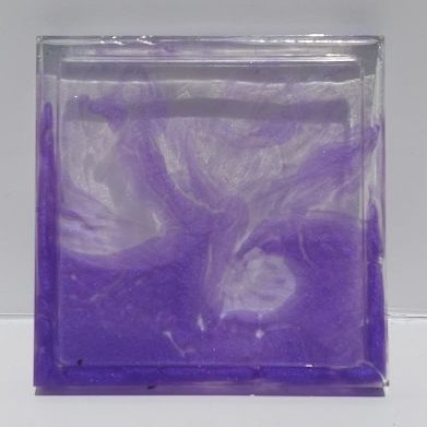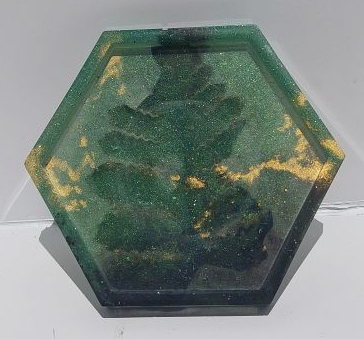 A small approximately 4.5in diameter hexagonal or square shaped coaster for holding tiny items or drinks made of Epoxy Resin. It is also sanded and finished on the top surface. This option entails selecting from a preset color pallet or picking three colors and a simple pattern.