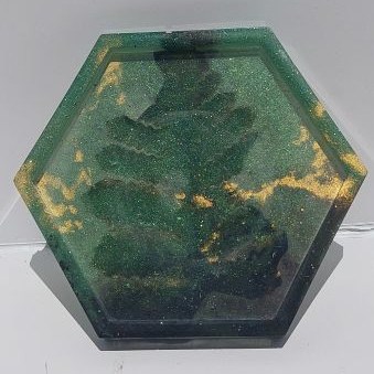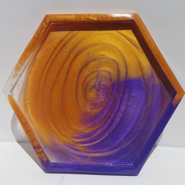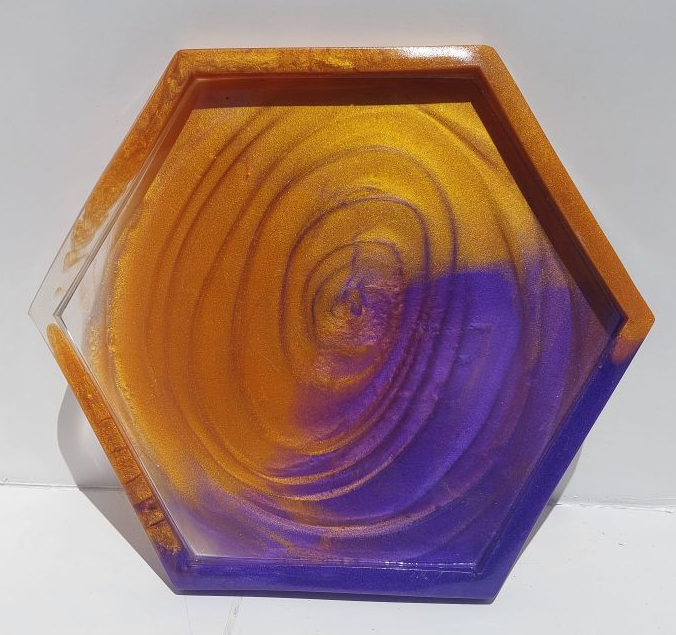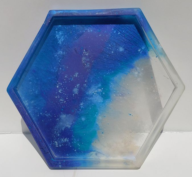 A moderately sized, approximately 9.5 in diameter hexagonal tray made with Epoxy Resin. It is also sanded and finished on the top surface. This option entails selecting from a preset color pallet and a simple pattern (petri dish style, small geode or tie dye like effects).