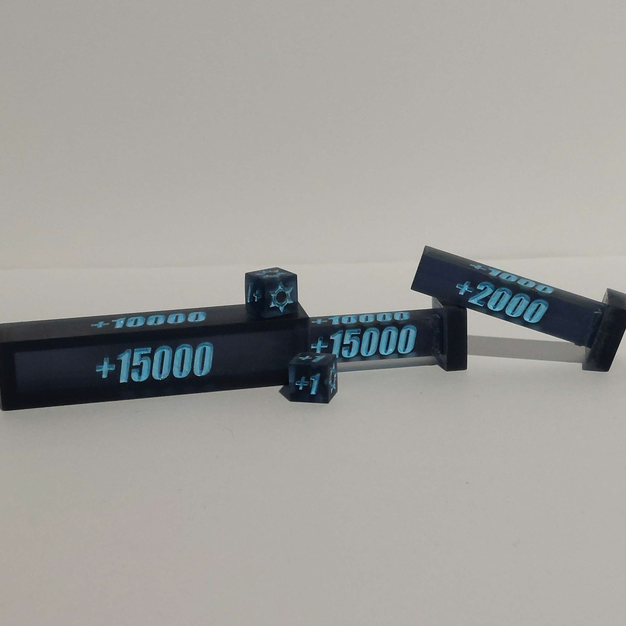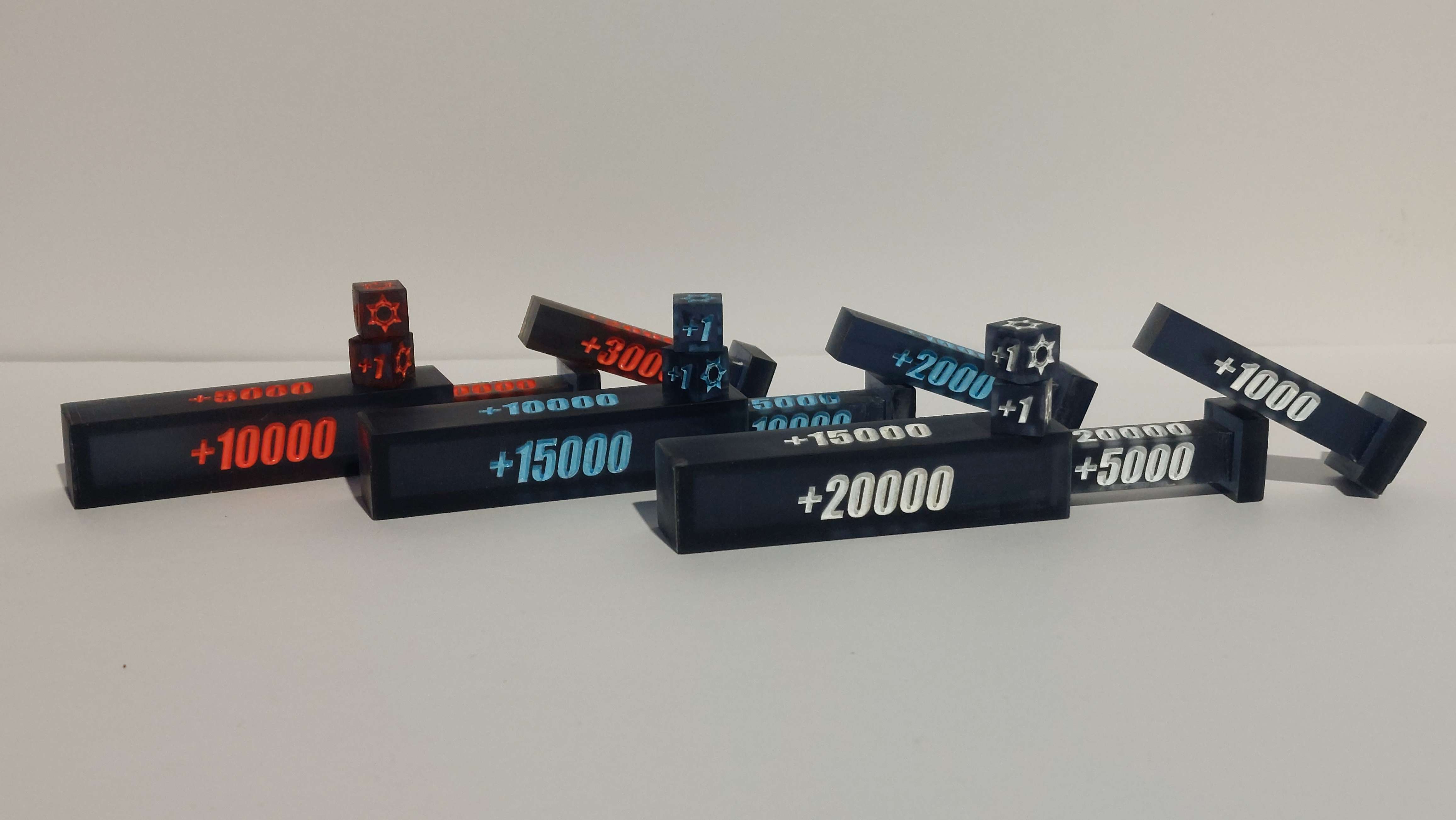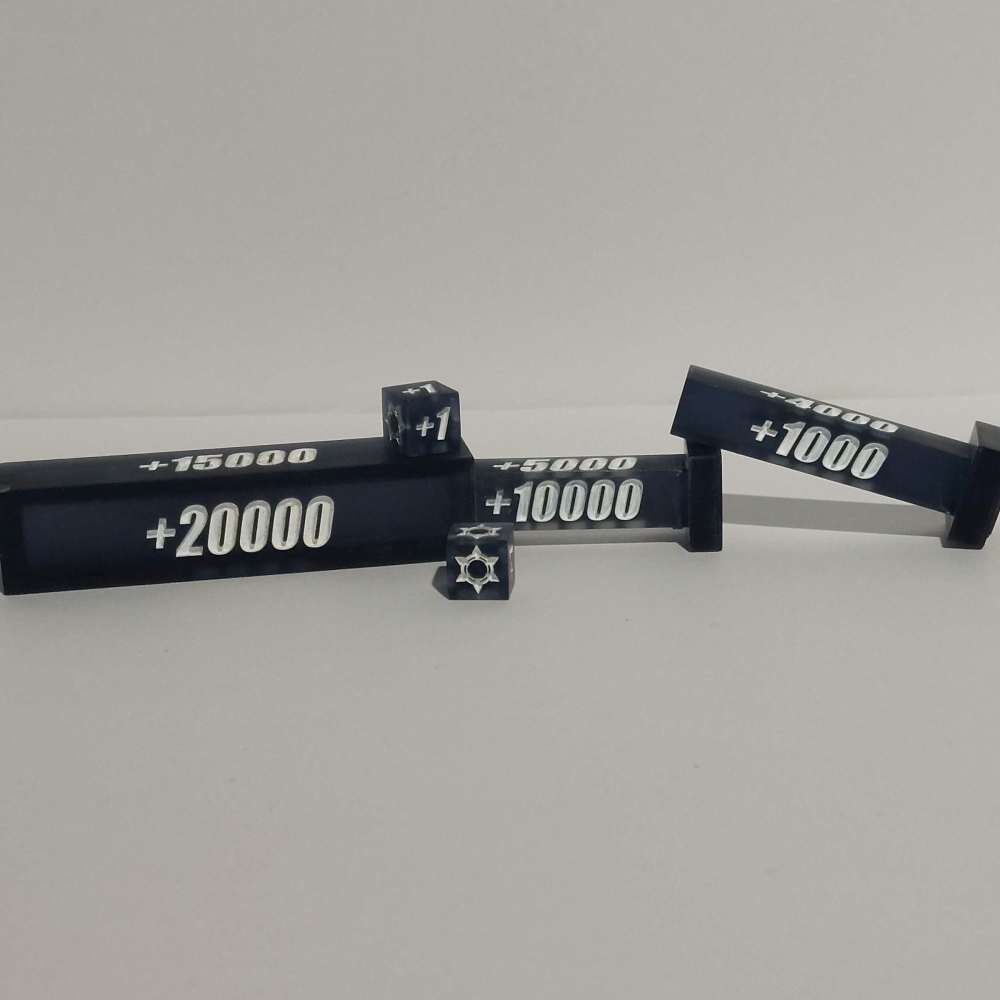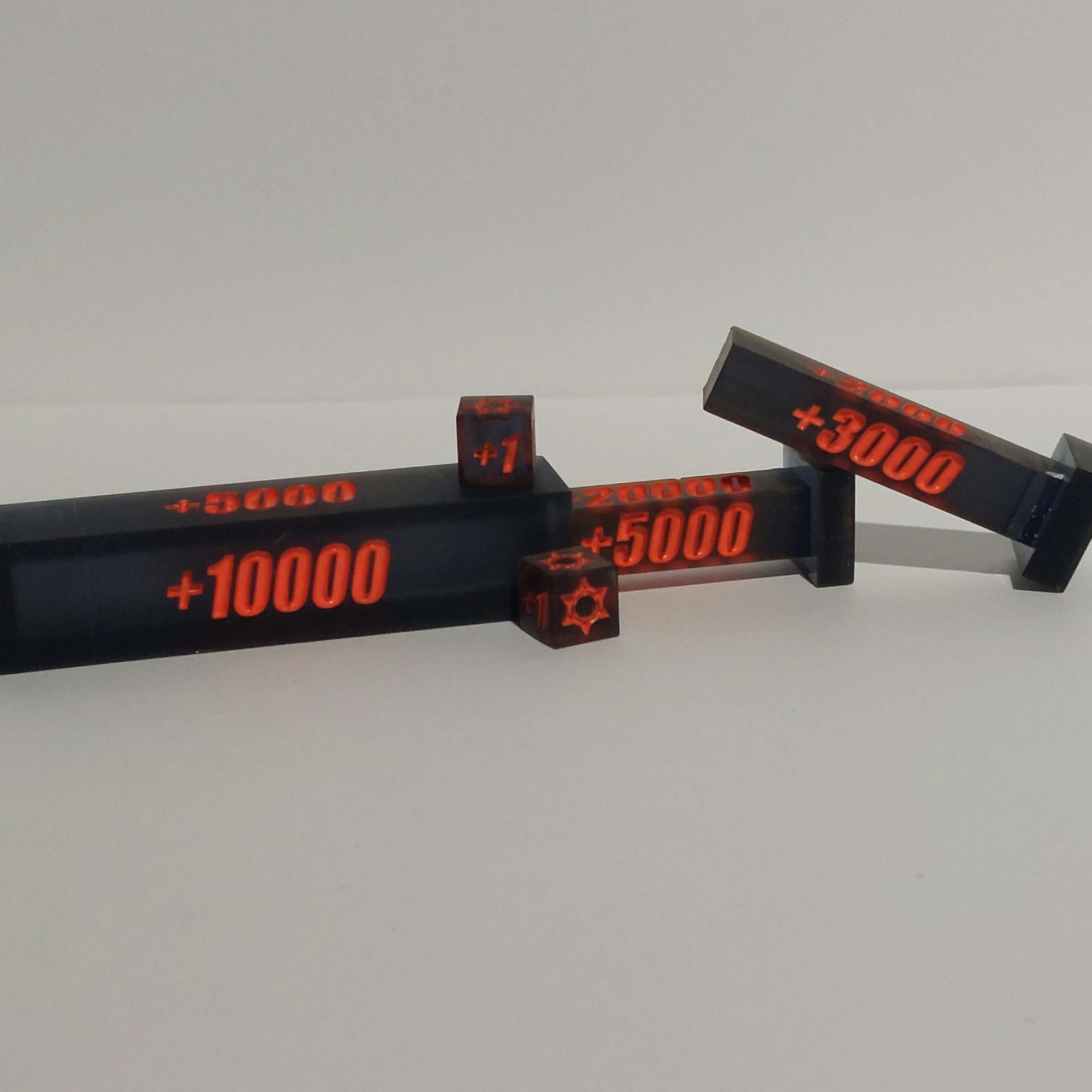 Ever find yourself in need of an easier way to denote all your counters on the board in Cardfight Vanguard? Well look no further, we’ve got a solution to that problem for you in the form of a portable counter set! This is a five piece set made of resin and currently is available with the White, Blue or Orange ink options. Each individual set comes with an outer slide, two inner slides and two dice that fit inside of the outer slide piece. The outer slide and one of the inner slides has a 5K to 20K increment while the second inner slide has 1K through 4K. Each dice has both +1 and Crit counters on them so you can denote both or one of each as required. Shipping is included in the price below but please include a message with the desired ink color!! Once the order is confirmed it will take about 7 to 14 days to ship out to you! If you’re outside the US but interested in ordering, reach out to us! We are willing to ship internationally if it’s feasible. Update: The first batch of counters now only has ONE orange ink style left. A restock is still in progress – new colorway examples will be added soon.